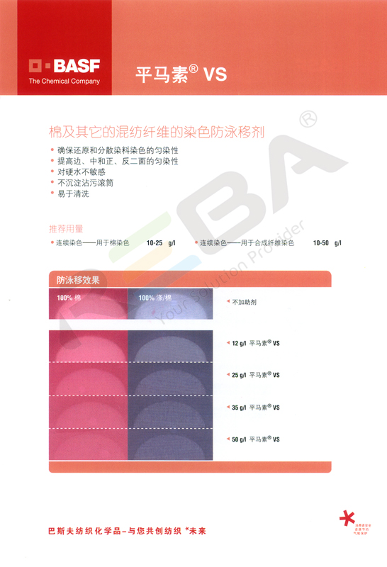 平馬素 VS 能阻止染料顆粒在中間烘燥過程中的泳移,所以能保證均勻的染色外觀,防止產生邊中色差和兩面色差。