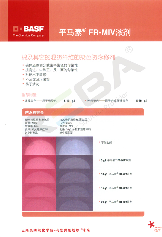 平馬素 FR-MIV 濃劑能阻止染料顆粒在中間烘燥過程中的泳移,所以能保證均勻的染色外觀,防止產生邊中色差和兩面色差。