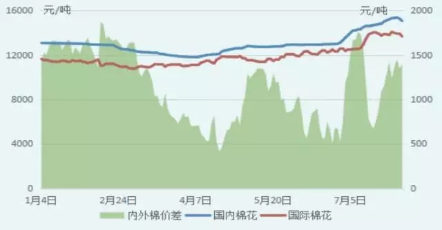 上半年棉花價格走勢基本受儲備棉投放影響為主,總體可概括為三個階段:第一階段為政策出臺前,市場對政策“以降為主”的預期為主導,國內棉價弱勢下行,國際棉價相對平緩,因此國內外棉價差在這個階段逐步縮小,在4月上旬,內外棉價差不足1000元/噸。