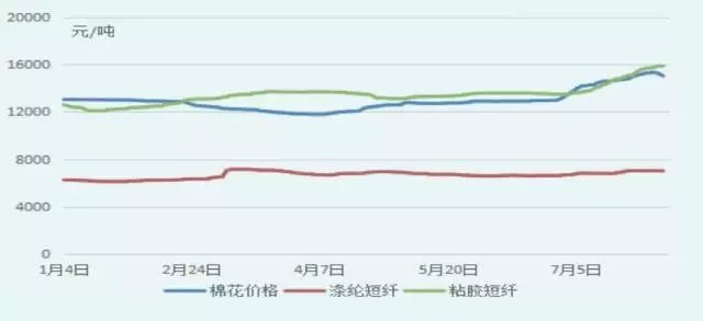 相對棉花價格,國內化纖短纖價格走勢平穩。棉紡織企業集中儲備棉采購,化纖短纖供需平衡,紡織企業隨用隨買,價格隨行就市。滌綸短纖價格受原油價格波動影響較大,粘膠短纖在儲備棉投放之前有小幅的增長,隨著儲備棉投放實施,粘膠短纖價格趨穩。7月,棉花價格快速上升期也加快了粘膠短纖價格的上行。